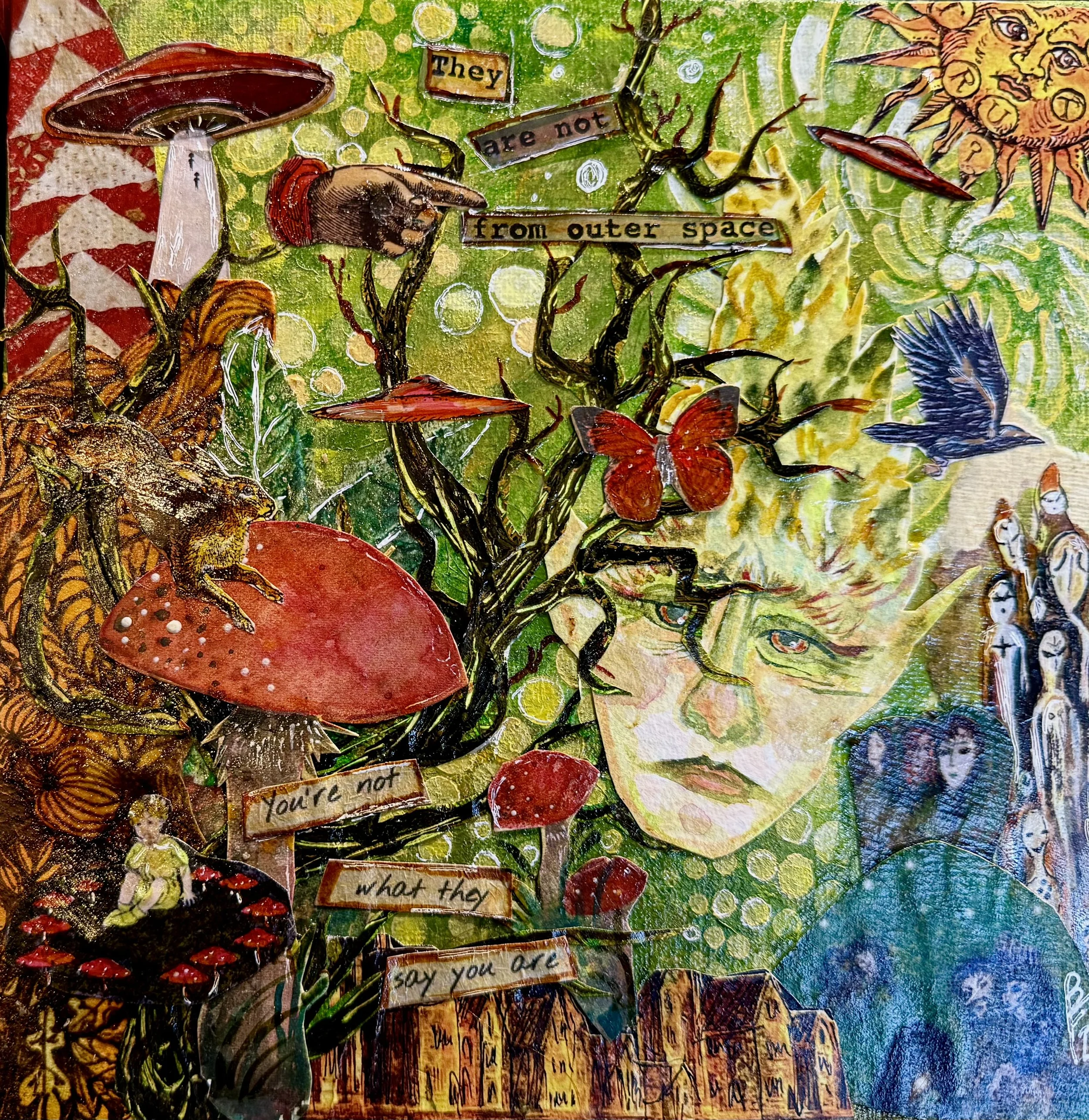 “Fairies, Fungi and Foxfire.” 2026, by Barbara Fisher. Mixed media collage: watercolor, ink, acrylics, woodcut images and vintage book illustrations on canvas board. There are original pieces of watercolor and ink work on watercolor paper in here,: especially the elfin face, amanita muscaria and background landscapes. I also used also many images from paintings and collages I made that I photographed, resized and used—this way I can use images over and over, connecting my works together over time.
